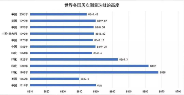 China, alone or in cooperation with international partners , conducted five large-scale geodetic survey field operations, data processing and corresponding research work on the height of Mount Everest in 1966, 1975, 1992, 1998 and 2005, including Projects such as astronomy, gravity, trigonometry, GPS positioning, elevation, and atmospheric refraction use both conventional technology and GPS positioning technology since 1992.