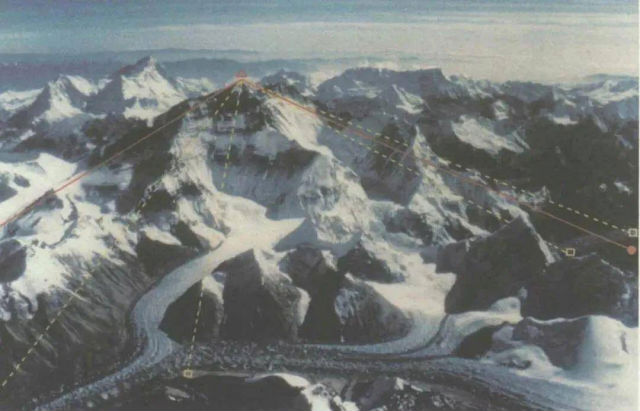 After this measurement, the triangulation points and conductor points extended to an average of 10 to 15 kilometers from the top of Mount Everest, and the elevations of the points were all above 5,600 meters. The gravity point was measured at 7,790 meters, 1.9 kilometers from the top of Mount Everest. It was the highest gravity point in the world at that time. The astronomical point was observed at 6336 meters, 5 kilometers from the top of Mount Everest. The nine measuring stations selected from the vicinity of Mount Everest are distributed in a 69-degree fan-shaped area centered on Mount Everest. The distance to Mount Everest is 8.5 to 21.2 kilometers, and the altitude is 5,600 to 6,240 meters. The surveying and mapping team members observed the horizontal and vertical angles of the Everest target at nine surveying stations. The horizontal position of Mount Everest and the horizontal distance from each measuring station to Mount Everest are determined based on the horizontal angle. According to the principle of trigonometric height measurement, these vertical angles and horizontal distances are used to determine the height difference between each measuring station and Mount Everest, and then the height of Mount Everest calculated from the mean sea level of the Yellow Sea in my country is derived. The final calculated elevation is 8848.13m (the depth of snow cover at the center of the peak is approximately 0.92m), with a medium error of ±0.35m.